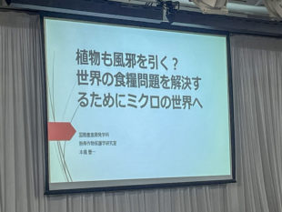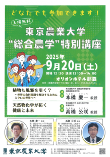 特別講座では、国際農業開発学科の本橋慶一教授による「植物も風邪を引く?~世界の食料問題を解決するためにミクロの世界へ~」、栄養科学科の髙橋公咲教授による「天然物化学が拓く健康と未来」と題した講演が行われました。