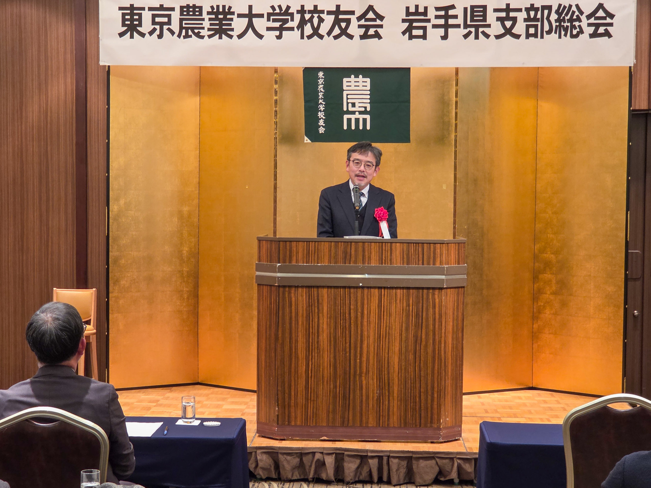 冒頭、運萬勇支部長(昭50林)の主催者挨拶が行われ、続いて来賓としてご出席いただいた校友会小野副会長から、校友会の現状と活動の目的・課題について説明がありました。さらに、地域環境科学部長の竹内康教授より、少子化の時代への大学の取り組みや、他大学での農学部新設の動向について紹介がありました。