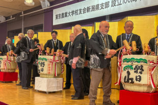 鏡開きの後、昭和32年農業工学科卒の第4代支部長・平野宏氏の乾杯で祝賀会が開宴し、県内各地から参加した校友で大盛況となった。 |